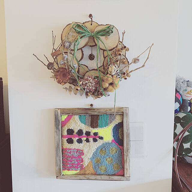 パンチニードルで作ったフックドラグを、壁掛けパネルにしていたrumikokubanさん。流木のフレームに入れて、味のあるディスプレイに作り上げていました。キレイな色味の糸を使ったアートのようなデザインは、白い壁によく映えます。ふわりとした質感の優しい雰囲気も魅力的です。