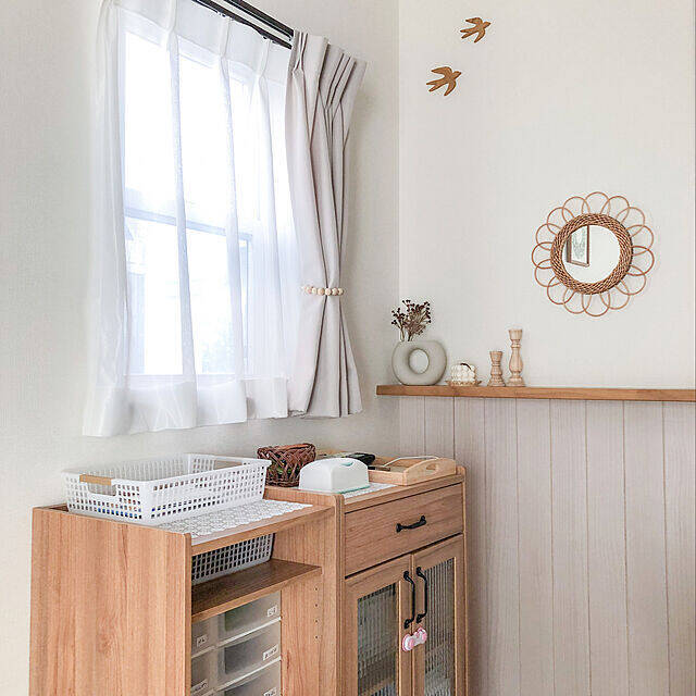 キャビネットの上に、よく使うものを置いているというユーザーさん。郵便物やチラシは手前のカゴに一時的に置き、その後仕分けして棚の中の個人トレーに移されているそうです。一時置きの場所と収納場所を近くするというのはぜひ真似したい工夫ですね。ホワイトとナチュラルの収納アイテムですっきり見せているのも◎です。