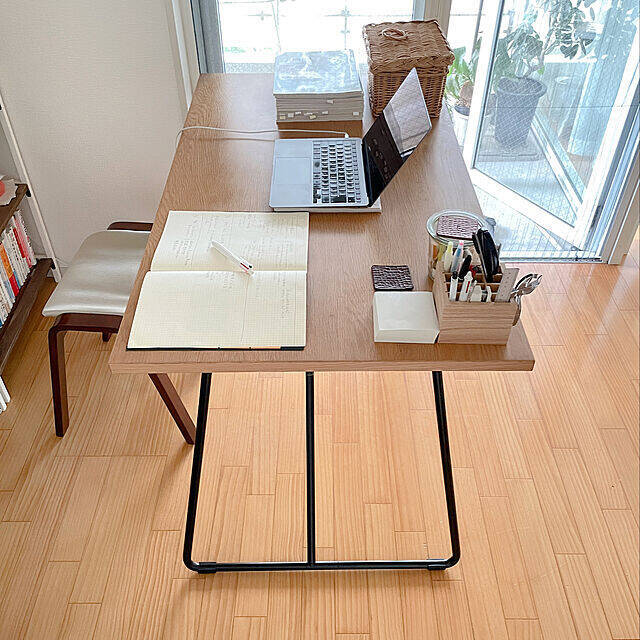 作業デスクに、無印良品の折りたたみテーブルを選ばれていた、warashibeさん。デスクは奥行60cmのものが多い中、こちらは70cmの奥行があるので、パソコンの手前にノートや書類を多くことができるそう。広々としたスペースが確保されていて、仕事もはかどりそうですね。