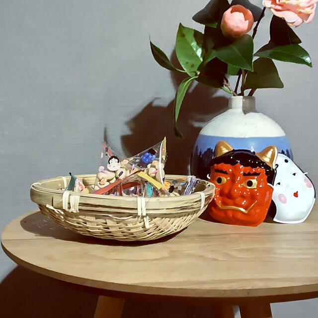 お庭のツバキや、鬼とおかめのお面とともに、カゴに豆を入れて、粋な演出で節分の準備をされた--rnrmm--さん。袋入りのまま豆まきをされるそうで、終わったあとの面倒な掃除の手間を省かれています。お菓子や、なんとお金も一緒に撒いて、にぎやかに楽しまれるそうですよ!