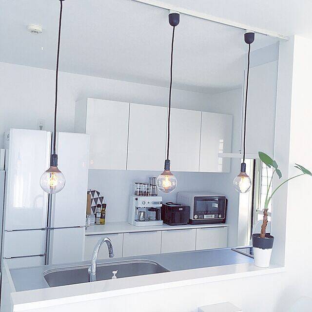 こちらは、a.organizeさんのホワイトキッチン。シンプルで清潔感があり、スッキリしたコーディネートに仕上がっています。家電や小物もモノトーンで統一することで、よりクリアな白の印象が引き立っていますね。