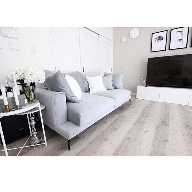 壁やフロア、ソファなどグレー系の色でそろえているユーザーさんです。それぞれニュアンスの異なる色を使うことで単調になるのを上手に避けています。サイドテーブルには白いお花を飾り、クッションにもフリルが取り入れられていてフレンチに仕上げています。