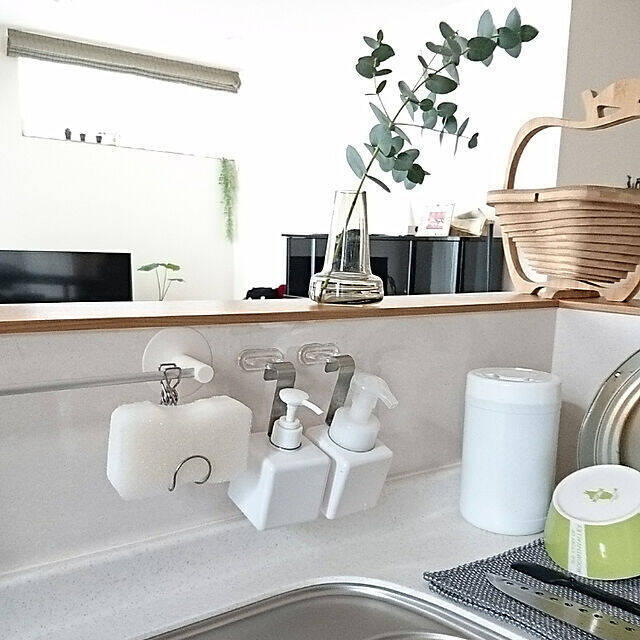 セリアのボトルハンギングフックでボトルを浮かして収納しています。そのフックを引っかけているのは、貼ってはがせるフィルムリングフック。セリアの収納アイテムをフル活用して上手にシンク周りを整理されています。セリアのフック付きピンチを逆さに使って、スポンジ収納にしているアイデアは真似したくなりますね。