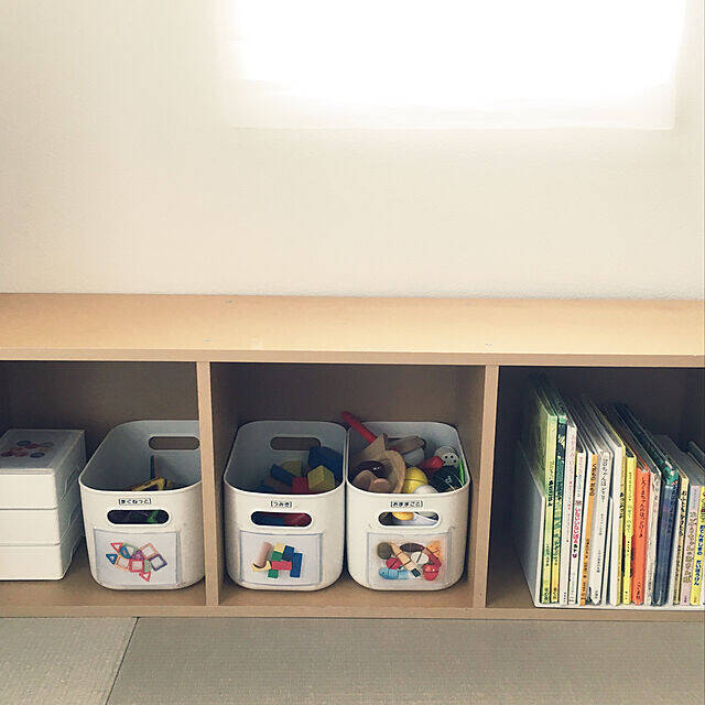 無印良品のソフトボックスがキレイに並んでいるのは、shimayaさん宅のキッズスペースです。布素材は子どもも扱いやすく、取っ手付きなので出し入れが簡単です。蓋付きタイプではなく、実例のように蓋なしを使うのもポイントです!片づけ動作がよりシンプルになるので、お子さんも継続してお片付けができそうですね。