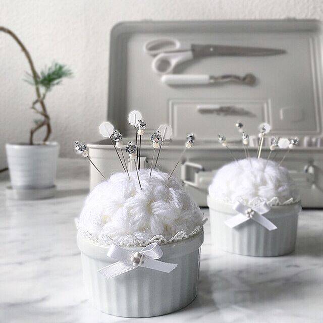こちらのユーザーさんは、毛糸を使ってピンクッションを作られました。ココットに入った真っ白でふわふわのピンクッションは、まるでスイーツのような可愛らしさ。リボンやレース、ビーズなどでデコレーションされた見た目に乙女心がくすぐられてしまいます。ビーズのついたまち針にも注目ですよ。