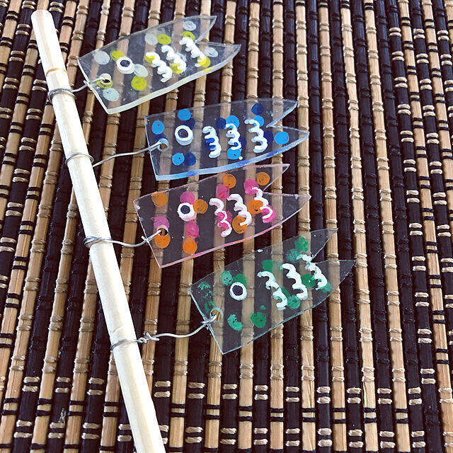 Yukicotoさんがプラバンで作られたのは、小さなこいのぼりのオブジェ。カラフルな手書きのイラストが、ぬくもり感たっぷり♪色とりどりのこいのぼりは、針金を使って木の棒に取り付けられています。こいのぼりが竿に並ぶ様子を表現する、いいアイデアですね。