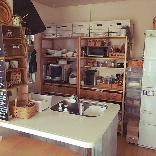 こちらのユーザーさんは、キッチンの背面にある木製シェルフの上にバンカーズボックスを置いています。食器や調理家電を見せる収納にしている、カフェ風のインテリアです。すべてを見せる収納にするのではなく、ワインの木箱やバンカーズボックスに収納して並べることで、すっきりとした印象にしています。