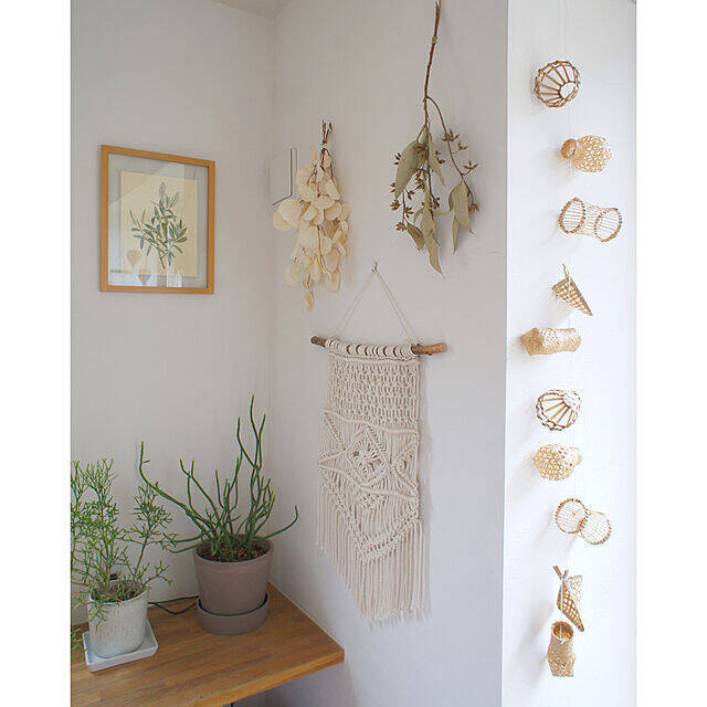 植物の小鉢を置かれたリビングのコーナー。noriflowerさんは、小鉢の周りの壁を、ドライフラワーやグリーンモチーフのアートなどボタニカルな小物で彩られています。また、素材の異なるナチュラルな雑貨もしつらえて、くつろぎ感を感じられる心地のよい空間になっていますね。