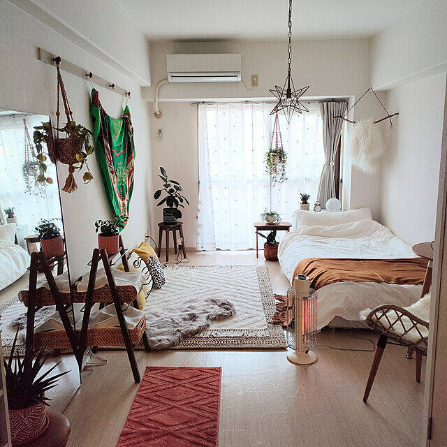 壁面の鮮やかなファブリック使いが印象的な、SYさんのインテリアです。ラグとクッションを組み合わせた床座スペースは、居心地が良さそうですね。実例のような大きな鏡を置くと、お部屋が広々として見えます。グリーンをスツール上に置いたり、上部から垂らしたりするテクニックにも注目です。