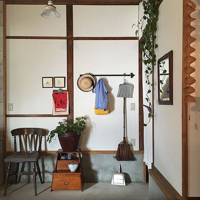 玄関の土間の壁に掃除道具をかけているユーザーさんです。ほうきは棕櫚(しゅろ)ほうきと呼ばれるもので、江戸時代以前から使われていたと考えられている掃除道具です。ブリキのような質感のちりとりや木製の踏み台と、お子さんの黄色い園バッグが一層の懐かしさをかもし出しています。