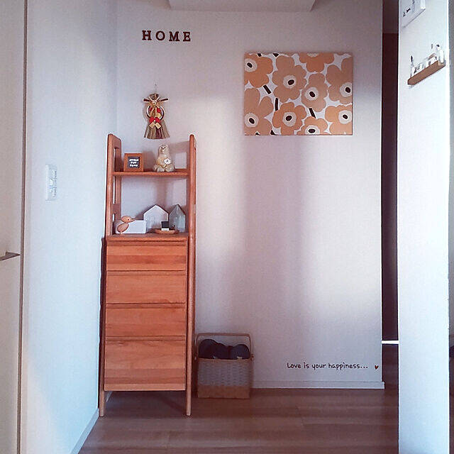今までは玄関の壁にウォールステッカーを貼って楽しんでいたとおっしゃるユーザーさんですが、ファブリックパネルとチェストでイメージチェンジしています。優しい色味のファブリックパネルと木製のチェストは相性バッチリ。とても居心地の良い雰囲気の玄関です。