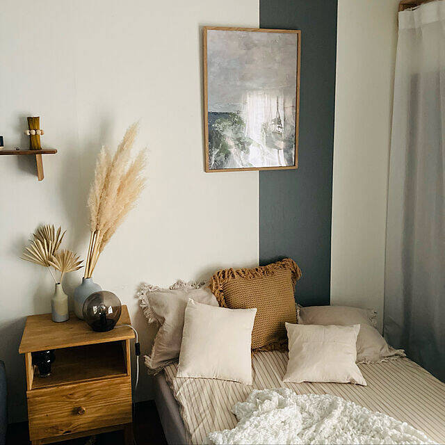 Yukiさん宅の寝室は、ダークグレーのアクセントクロスです。暗めのグレーは空間を引き締め、シックで落ち着きのある雰囲気を演出してくれます。パレットベッドや花柄のファブリックでコーディネートされた、海外風の雰囲気も素敵ですね。
