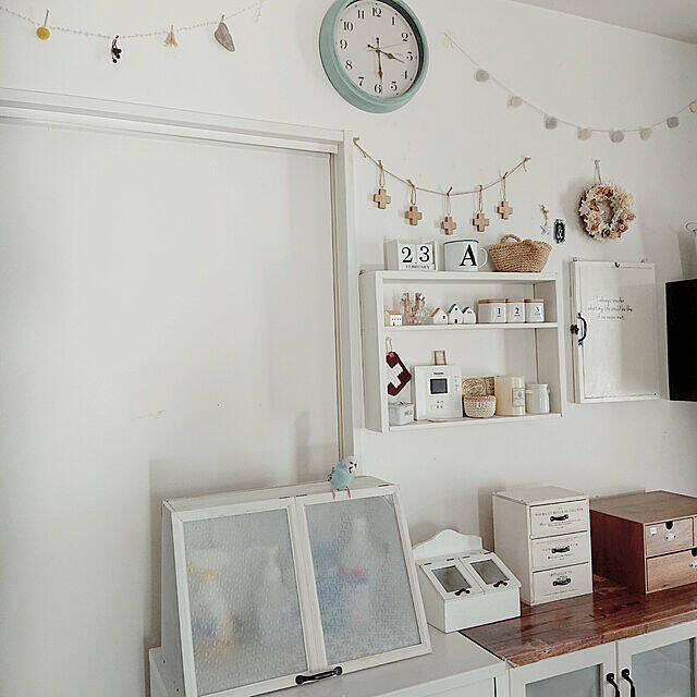 riceさんは、中が見えにくいショーケースを棚に置いて、アルコール消毒を収納しています。生活感が出やすい日用品のパッケージをうまく隠すことができる真似したいアイディアです。ホワイトの枠組みに黒い取っ手のショーケースは、すりガラスのような扉がレトロでナチュラルな風合いです。周りの雑貨と調和しています。