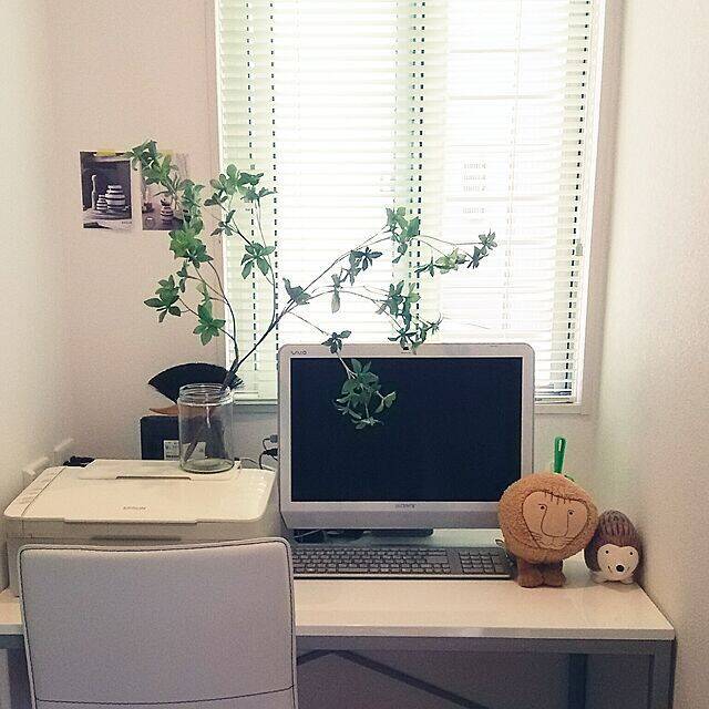 chihiroさんはPCコーナーの一角に、リサラーソンのライオンとはりねずみのぬいぐるみを置いています。白を基調とした光が差しこむ明るい空間にマッチ。癒されて作業がサクサク進みそうですね♪