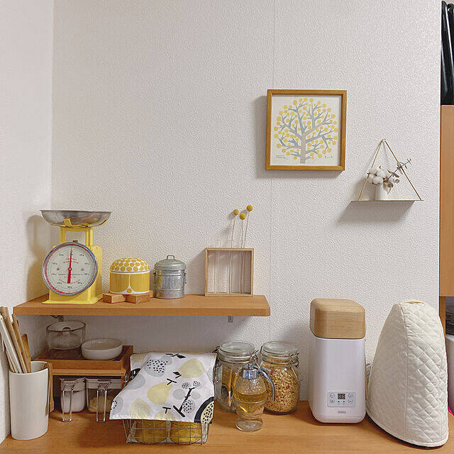 キッチンの背面収納に、アートや雑貨でレモンイエローのアクセントをつけている実例です。ベージュ系と組み合わせると、ナチュラルでほっこりしたイメージになりますね。キッチンまわりは、特に雑然としやすいエリアですが、カラーに気を配るとまとまりやすくなります。