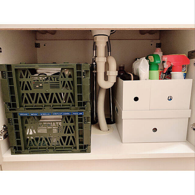 こちらのユーザーさんは、小さめサイズのコンテナボックスを洗面所のシンク下に置いています。ダイソーのアイテムだそうで、プチプラがうれしいですね。散らかりがちなシンク下も、これならすっきりとして見えます。