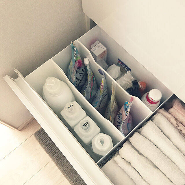 こちらのユーザーさんは、ストック場所として、洗面台の下を活用されています。引き出しやフォルダーボックスなどを組み合わせて、整理整頓されたスペースはとても使いやすそう。詰め替え用の大きなサイズの洗剤ストックに合わせた、フォルダーボックスを用意されているそうですよ。