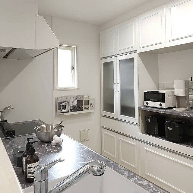 対面キッチンのカウンター下にクッションモールディングを取り付けられている+TAKAKO+さん。縦のラインと四角形のモールディングに、お花のオーナメントをプラスし、自分好みにアレンジされたそうです。優雅でクラシックなデザインが、フレンチシックなインテリアに似合いますね。