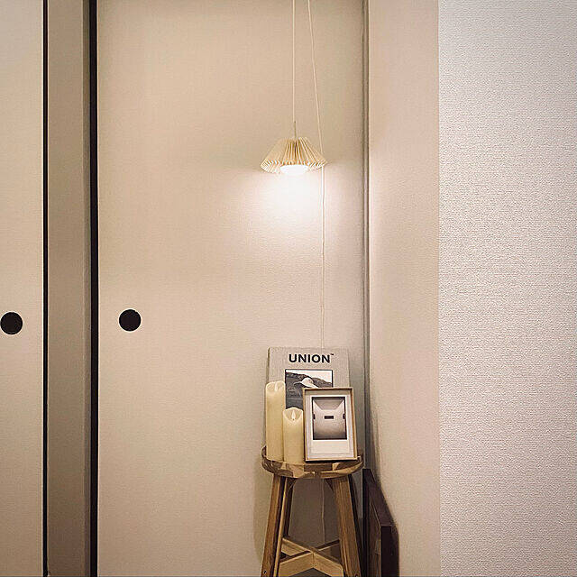 kazさんは、玄関が暗いときのためにIKEAの人感センサーのランプを取りつけたそうです。照明が点灯したとき、IKEAの上のスツールにディスプレイされたキャンドルやフレームが浮かび上がって、ほっとした気持ちになれそうですね。