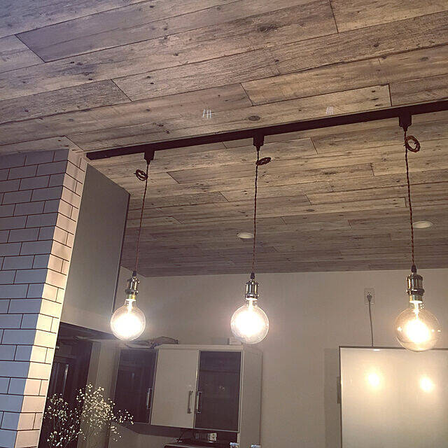 yusoitoさんは、ホワイトのランプシェードをセレクト。カフェ風インテリアにぴったりなナチュラルな色味で、洗練されたシンプルなデザインです。同じくホワイトのソケットの電球を一緒に吊るしているのも、統一感が出ていいですね。