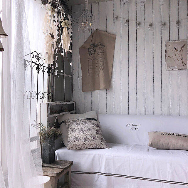 tarさんのお部屋は、アンティーク調のホワイトインテリアです。繊細さを感じるデザインとナチュラルな色味のクッションカバーを選び、海外風コーディネートに。黒の引き締め効果もあって全体にまとまりが出ていますね。