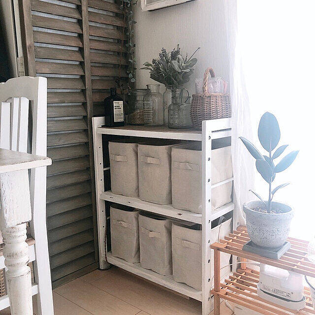 tarさんが白いオープンシェルフと組み合わせているのは、無印良品の「ポリエステル綿麻混・ソフトボックス」です。綿や麻といった自然素材が使われているので、シンプルな中にナチュラルな風合いが感じられますね。正面に持ち手が来るように置かれているので、棚からサッと引き出せて使い勝手がよさそうです。