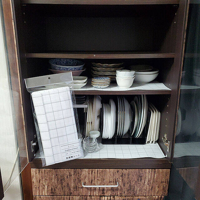 まずは、食器棚に敷いて活用されている実例をご紹介します。おしゃれな柄入りなので、いつもの食器棚がぱっと明るい雰囲気になりますよ。