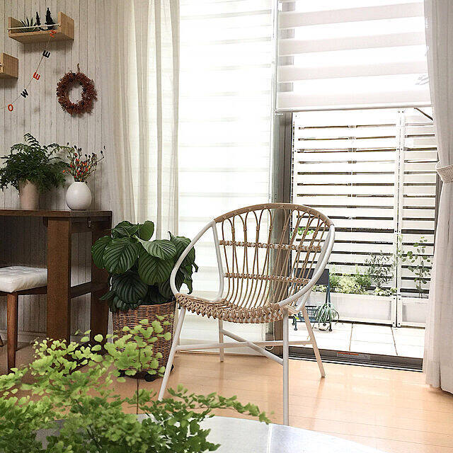 こちらのユーザーさんは、簾の代わりにニトリの調光ロールスクリーンを取り付けられました。ナチュラル感のあるホワイトメインのインテリアに、白いロールスクリーンがベストマッチしており、お部屋をより明るく見せてくれています。天気によって、入ってくる光の量を調整できるというのがうれしいですね。