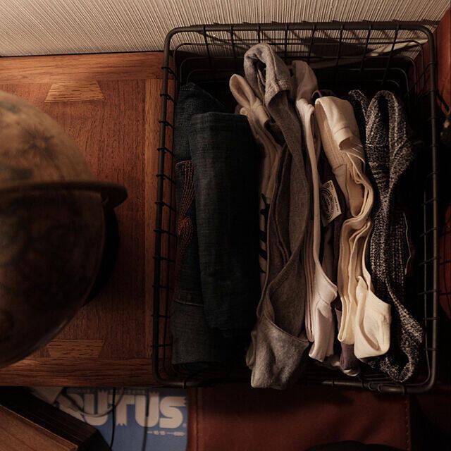こちらの実例では、Tシャツを畳んで黒のカゴに入れ、そのままリビングに置いています。アースカラーのTシャツはカゴと相性抜群で、男前な雰囲気に仕上がりますね。コンパクトにまとまっていて使いやすそうです。