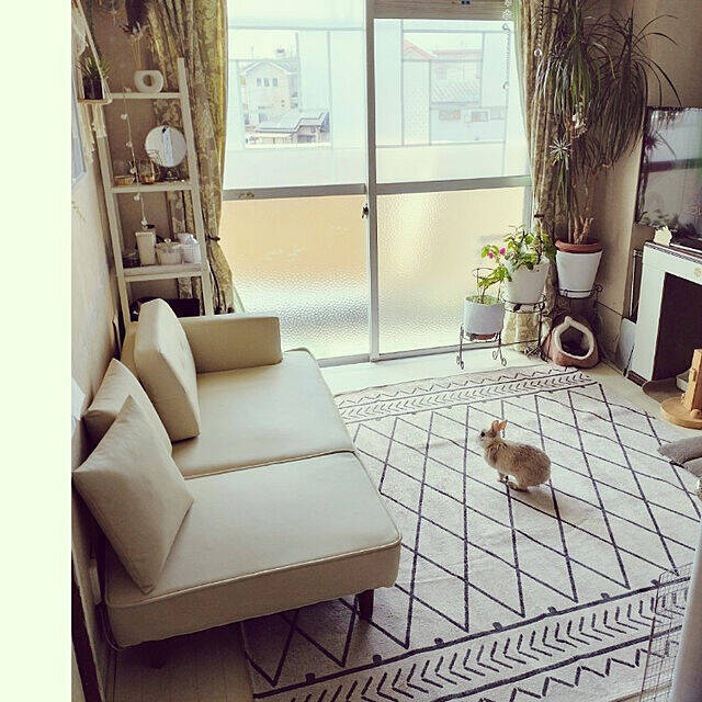 yokomokoさんのお部屋ではラグの幾何学模様がアクセントになっていて、ソファの優しい色合いを引き立てています。こちらのソファは、オットマンの置き場所を変えることで、さまざまなレイアウトを楽しめるのがポイント。yokomokoさんも、オットマンをセパレートで使っている様子を投稿してくれていますよ。