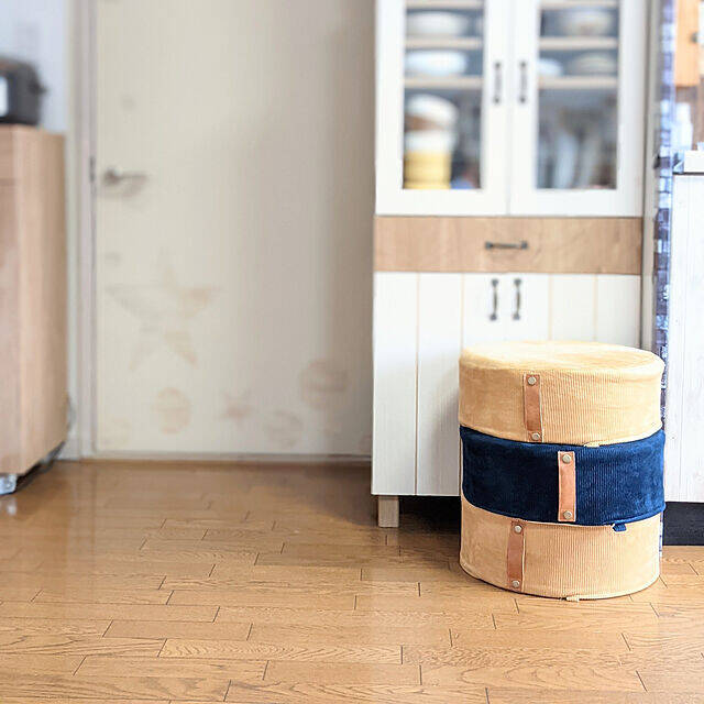 kids5さんは「フロアスツール コーデュロイ」をダイニングチェアの代わりに使っているそうです。コーデュロイの素材に、持ち手のベルトがアクセントになっていてオシャレですね。使っていないときは重ねて置けるのも、場所を取らず便利です。