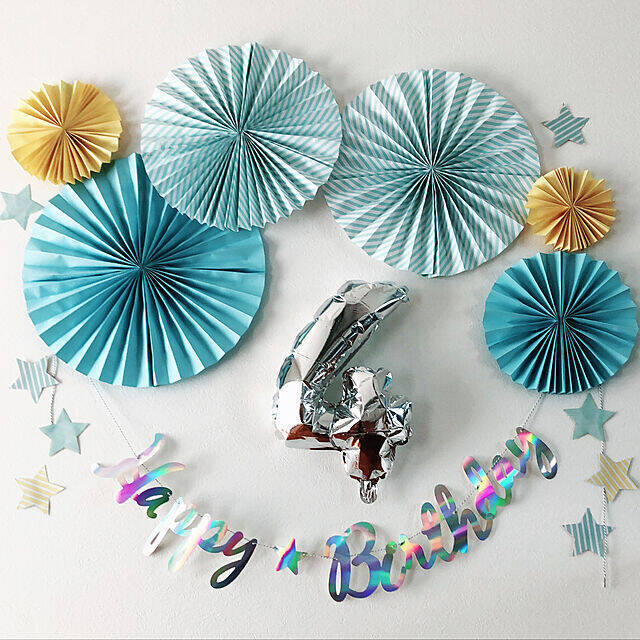 明るいブルーのペーパーファンをメインに、キラキラ光る数字バルーンやガーランドを組み合わせた、ポップで元気なバースデーデコレーション。ペーパーファンは、模造紙を使った手作りだそうです。ストライプの紙を使ったり、サイズを変えたり、差し色のイエローを加えたり…… 工夫を凝らして作られていますね。