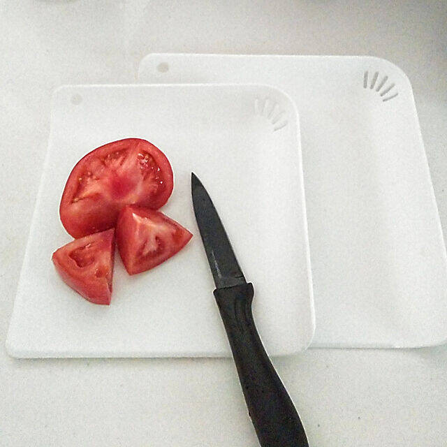 h.t.さんは、ダイソーの省スペース多機能まな板を使っています。食洗機・熱湯・漂白OKで、ちょっとしたものを切るのに便利なコンパクトサイズが魅力的。フックにかけられる穴付きなのも収納にうれしいですね。h.t.さんは普通のまな板よりも使う機会が増え、サイズ違いで2つそろえたようです。