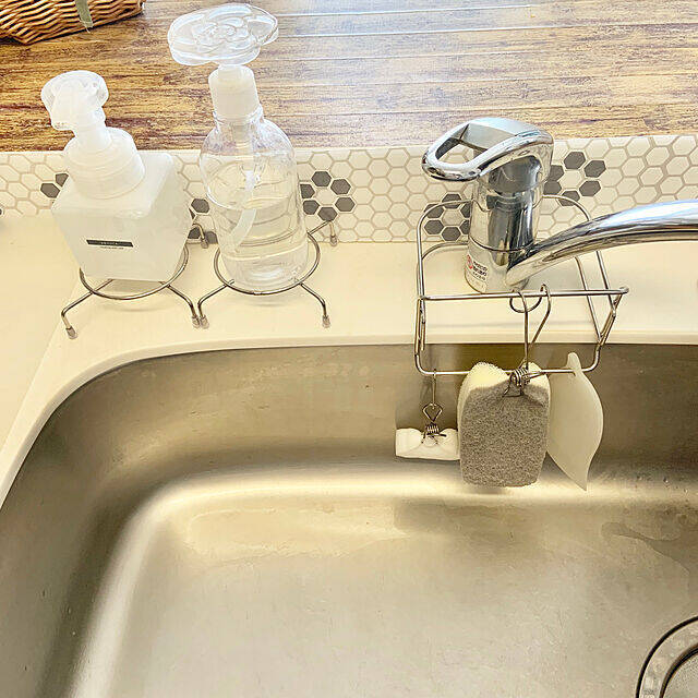 ダイソーの「浮かせるスポンジホルダー」を使用し、キッチンシンクに使用するスポンジを浮かせています。スポンジホルダーは意外と場所をとるため、スポンジを浮かせることでキッチンシンク内の作業スペースが広がりそうです。水切れもよさそうなので、スポンジのぬめりで悩むこともなくなりそうですね。