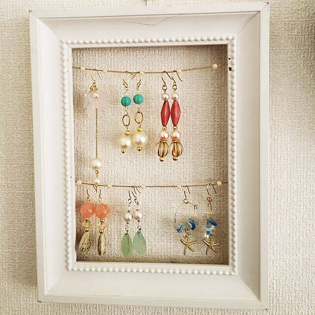 まずは、フレームや有孔ボードなどを使ってDIYし、ピアスやネックレスなどを吊るして収納している実例をご紹介します。長いチェーンが絡んでしまう心配が少なく、お気に入りたちを見せて収納することができるのも魅力です。