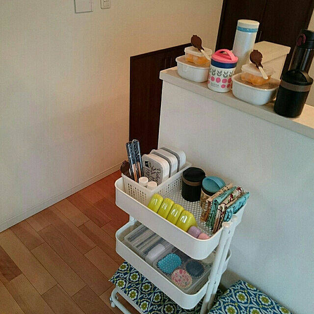 こちらは、キャスター機能を上手に活かしたアイデア。重たい飲料水やお酒などのストックを収納しています。ぱっと在庫が見えるだけでなく移動もでき、お掃除が楽にできそうです。小さい方のワゴンはIKEAのロースフルトで、こちらはペット用として使っていらっしゃるそうですよ。大小横並びになった姿もキュートです。