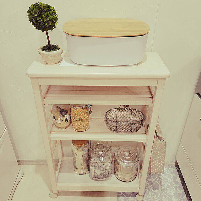 すっきりとナチュラルな、ホワイトの「RIG-TIGブレッドボックス」。白を基調とした、やさしげなインテリアにマッチしています。ユーザーさんはキッチンワゴンの天板にのせ、雑多なストック類をしまっているそうです。ごちゃつきがちな物を手軽に、見栄えよく収納する、よい方法ですね。