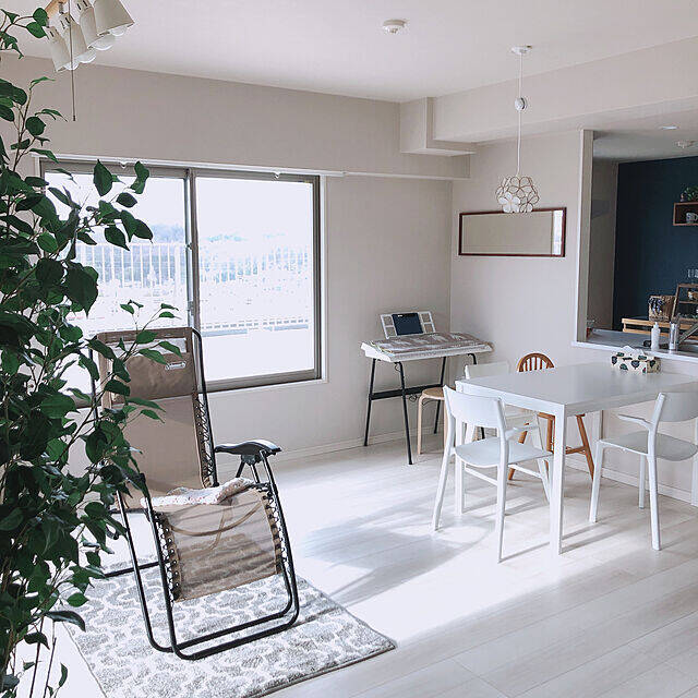 リラックス重視の方におすすめなのが、リクライニング機能が付いたアウトドアチェア。K84Roomさんは、コールマンのインフィニティチェアをリビングに置いています。シンプルで風通しのよさそうな空間に、アウトドアチェアが軽やか。背もたれを倒して、気持ちよくお昼寝してしまいそうです。