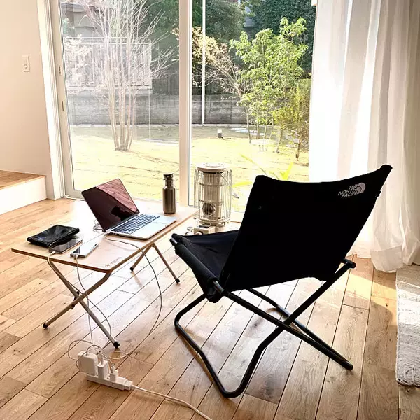 joysさんは、ザ・ノースフェイスのアウトドアチェアに座って、リモートワークをしています。シンプルなブラックのチェアは、デスクまわりをかっこよく決めてくれますね。すっぽりと収まる感じで、座り心地もいいそう。そのほかにも、お庭で軽食をとるときなどに活躍しているそうです。まさに、万能チェアですね。