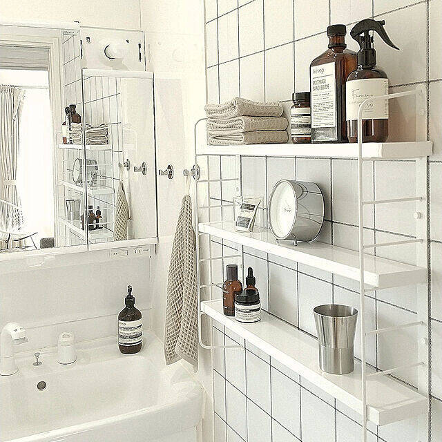 IROHAさんは、取っ手付きの収納ボックスを使用して洗面所の棚を整理整頓。素材や色が違うものを使っても、形を同じにすることで全体的に統一感が出ています。ナチュラルなバスケットを取り入れることで、海外風ヴィラのような雰囲気にまとまっていますね。