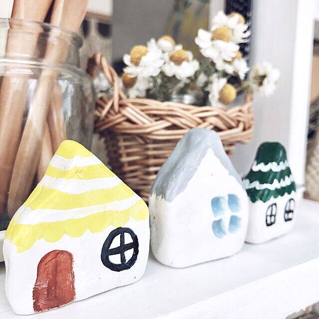 Appletreeさんは石膏粘土で作ったおうちのオブジェを、ダイソーの水性絵の具で色付けしました。手作りならではの優しい風合いに、透明感のある水性絵の具だからこそ出る、色むらが味のある作品です。