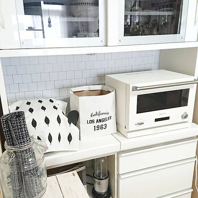 収納家具や家電をホワイトでそろえ、ところどころにブラックを取り入れたモノトーンインテリアの実例です。棚の右端に置かれているのは、バルミューダの電子レンジ。無駄のない洗練されたデザインで、整ったキッチンを演出しています。コンパクトな佇まいが置きやすそうです。
