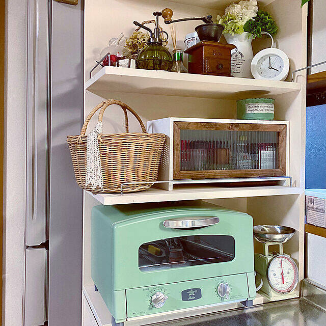 ホワイトカラーをベースに、抜け感を作ることを意識されているfumitanさん。キッチンの棚も、モノトーンカラーを中心にまとめられています。アラジンのトースターは、下段に配置されました。コンパクトなサイズで、きちんと収まっていますね。