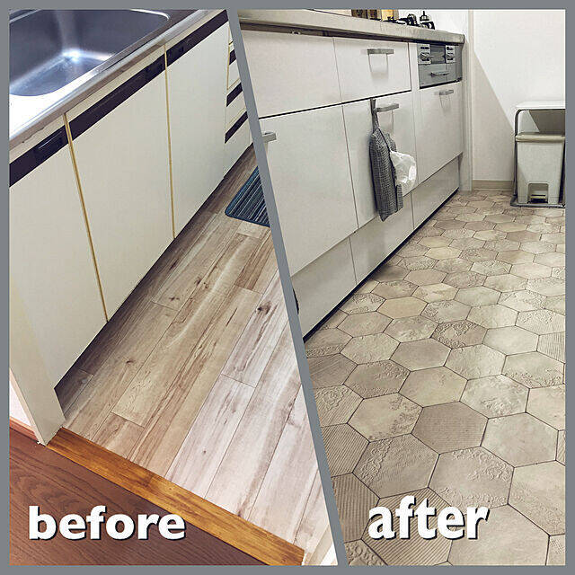 キッチン全体をリフォームしたこちらのユーザーさんが、特に気に入っていると投稿してくださったのは、タイル風の床。こちらはクッションフロアだそうですよ。六角形の大きなタイル模様と、さり気ない花柄がかわいらしいですね。汚れが目立ちにくい色合いでもあるそうで、まさにキッチンの床に最適です。