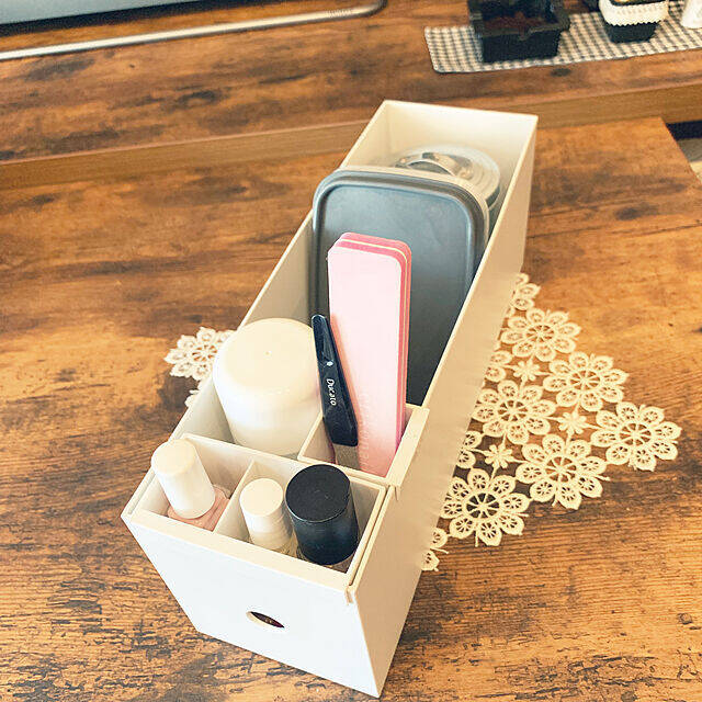 yasuyo66さんはネイルケアに使うグッズを、ファイルボックスにまとめて収納されていました。細々とした爪やすりやマニキュアは、内側に取りつけたペンポケットと仕切付きポケットの中に入れています。これならネイル中も片手でサッと取り出せて便利ですね。