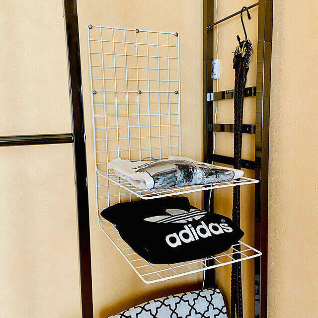 100均のワイヤーネットを使って、棚を作っているmymiさんの実例です。作り方は、お好みのサイズに曲げたワイヤーネットを長めの押しピンで固定するだけとのこと。お洋服のデザインも見やすい、ナイスアイデアです。