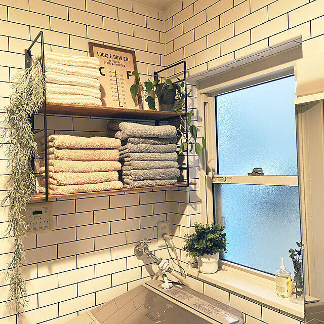 壁に取り付けた棚にタオルを置いている、gachaさん。見せる収納にしたことでタオルを置くスペースが確保できたそうですよ。ふんわりとしたタオルとグリーンがバランスよく飾られていて、やわらかい雰囲気がすてきです。