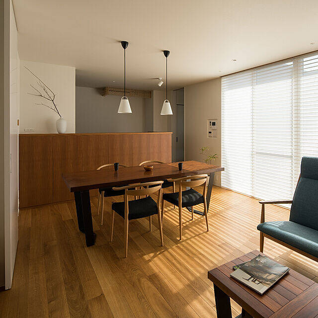 たくさんの日光が入ってくる、広々したリビングの実例です。ミニマムに抑えられた家具は深めのブラウンで、落ち着きあるテイストに仕上がっていますね。最低限の家具だけを置くことで、フロアや家具のナチュラルな質感がぐっと引き出され、自然の癒しを感じられます。