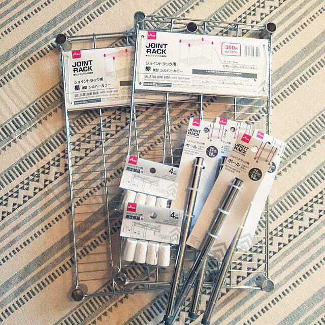 futukoさんが購入してきた状態のジョイントラックを見せてくれましたよ!このように、ポールや棚、バスケットや固定用部品など、用途に合わせて必要なパーツを購入します。組み立て式なので店舗で購入した際もコンパクトに持ち帰れるのが良いですね。こちらは洗面所の洗濯カゴ置きとして活用予定だそうですよ!