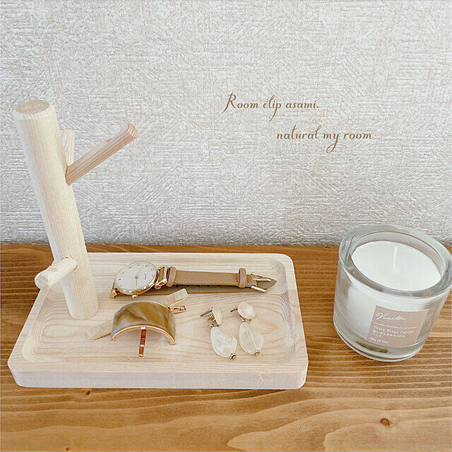 木の温かみのある雰囲気を生かした、デザインが魅力的なダイソーの木製収納ラック。ナチュラルカラーなので、幅広いインテリアに違和感なく馴染みそうです。asami.さんの優しい色合いのアクセサリーとも相性ぴったりですね。引っ掛けて収納できるため、ブレスレットやネックレスの収納にも◎。
